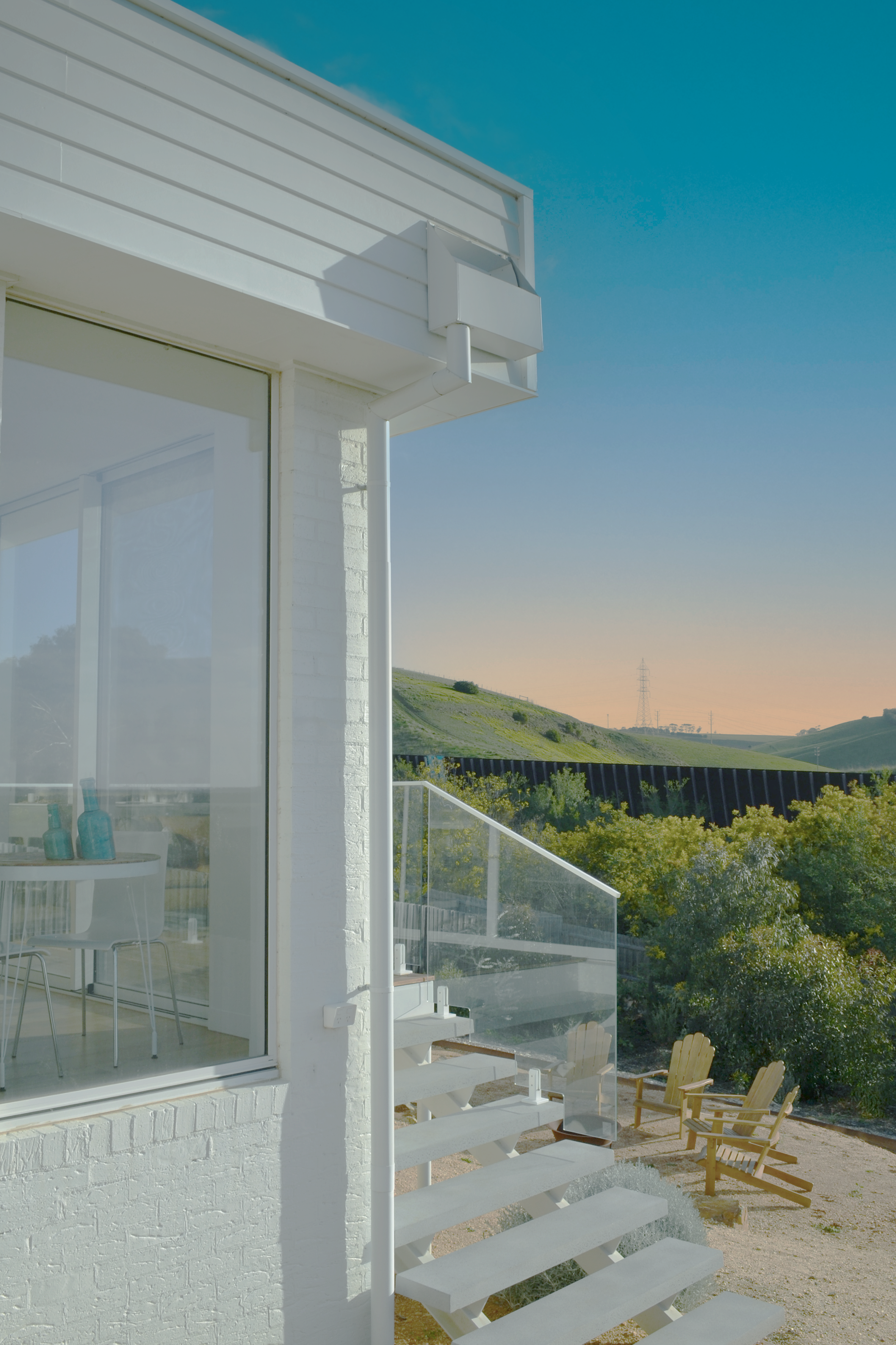 The primary living space is anchored by full-height glazing to the west, framing long views and reinforcing a strong connection between interior and horizon.