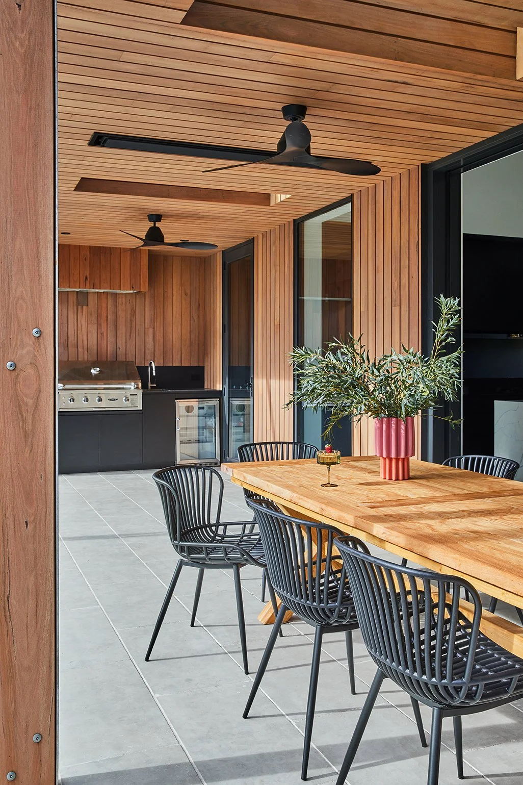 This rural home is composed of three sequential gabled forms, connected by a continuous blackbutt pergola. The pergola becomes a unifying element, linking the primary dwelling with the pool house, shed, and external kitchen, while establishing a consistent rhythm across the site.